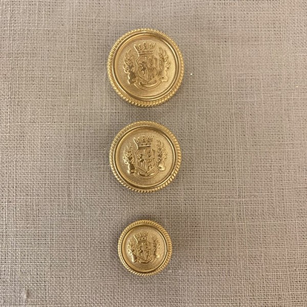 Bouton en métal pour blazer et manteaux, sur pied un peu bombé, palmes et motif héraldique en volumes sur fond strié. Liseret en contour du motif et bord cannelé.